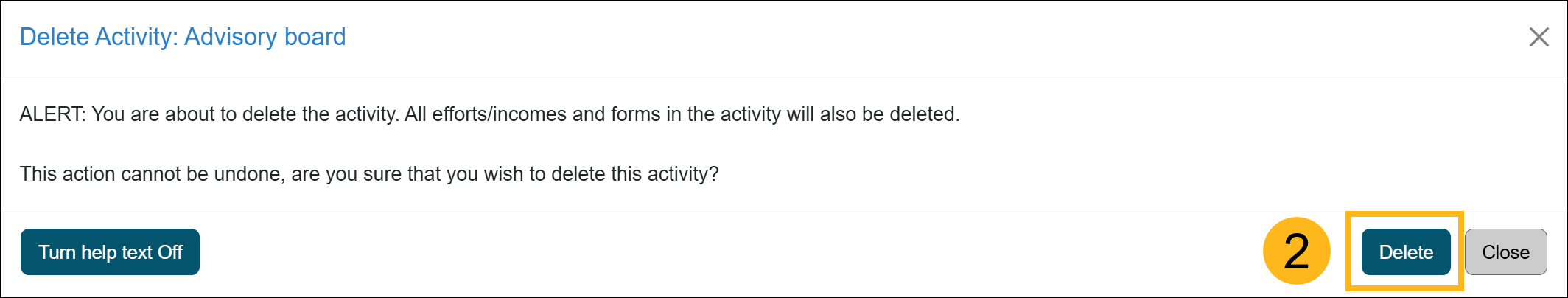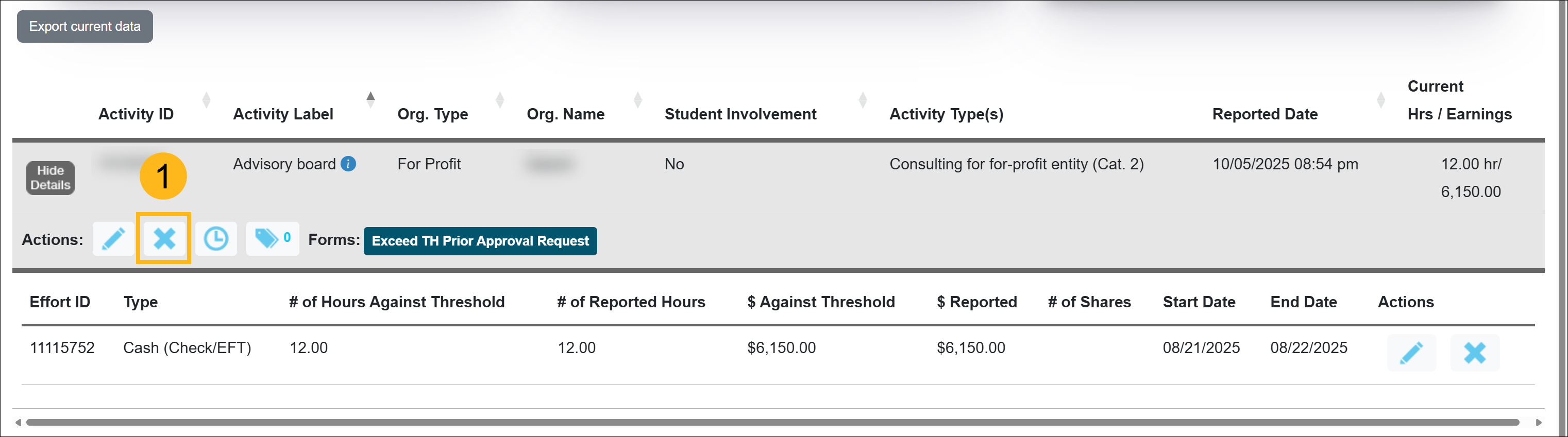 This article provides instructions on how to delete an activity from your workspace. You can delete an activity along with any associated effort and prior approval forms — except for those linked to an approved Category I form — by selecting the Delete button.